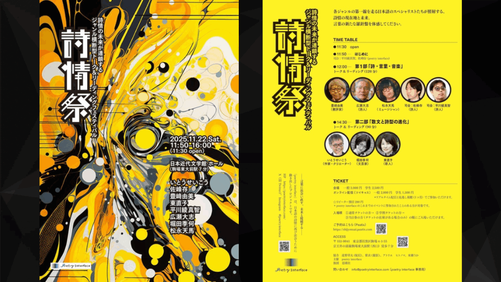 ■「poetry interface」について ―日本語の詩情に再び出会うためにー 「poetry interface」のwebサイトをオープン致します。 「poetry interface」は、日本語の詩情に再び出会うために動き出したプロジェクトです。震災やコロナ禍を経験した現代社会におい... イベント■「詩情祭」■「詩情の未来が連鎖するーージャンル横断型トーク&リーディングフェスティバル」開催(2025/11/22)■